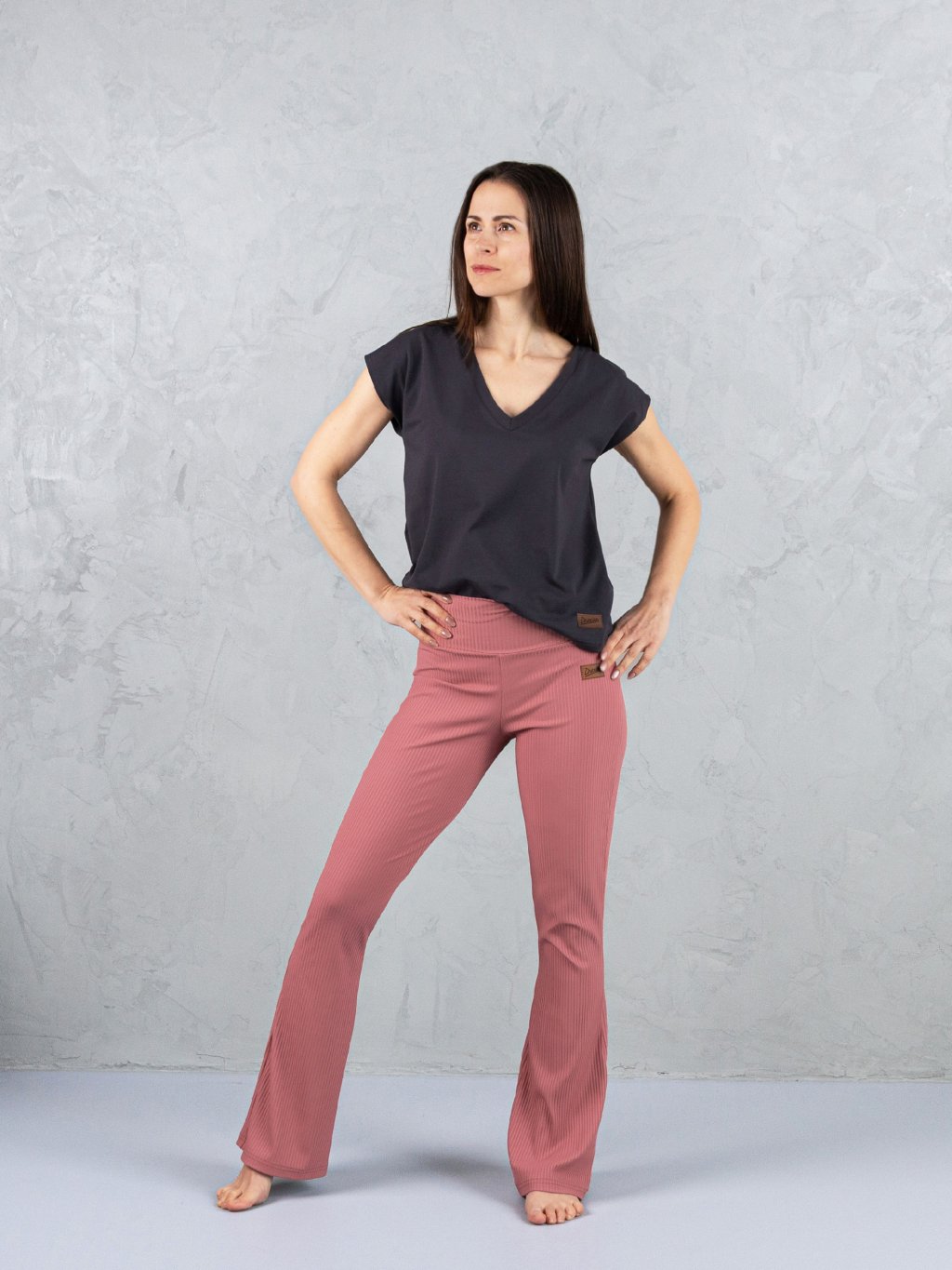 - Bavlněný úplet s elastanem – materiál je příjemný na dotek, skvěle se nosí a přizpůsobí se pohybu během dne.