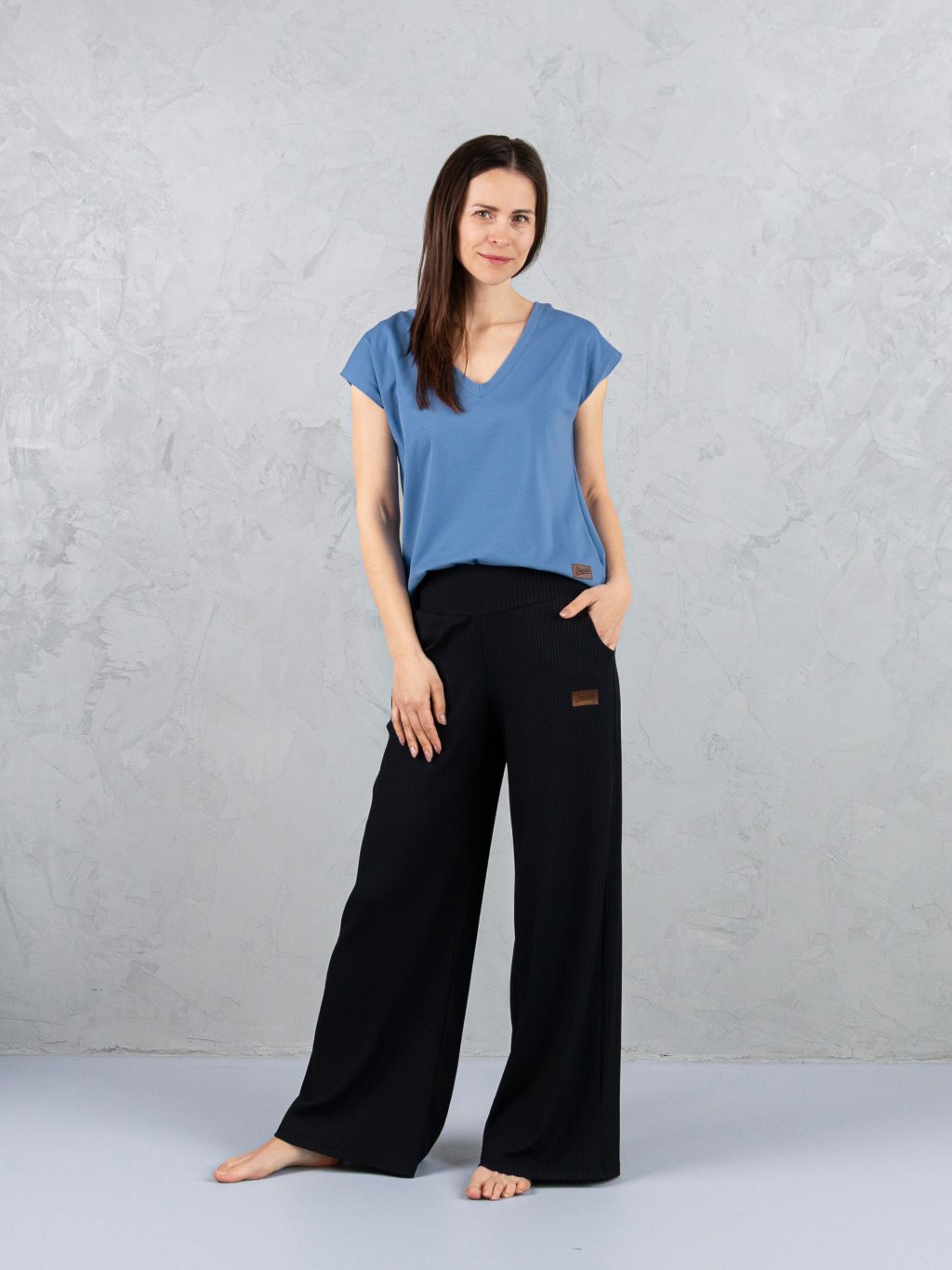 - Bavlněný úplet s elastanem – materiál je příjemný na dotek, skvěle se nosí a přizpůsobí se pohybu během dne.