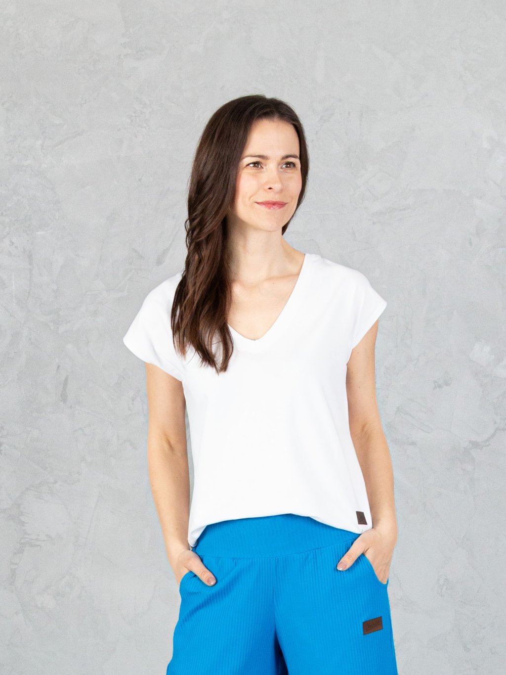 Spadlý rukávek a volnější střih dodávají tričku ležérní styl, zatímco výrazný V výstřih lichotí dekoltu. Můžete jej nosit volně nebo zastrčené – podle nálady a typu outfitu.