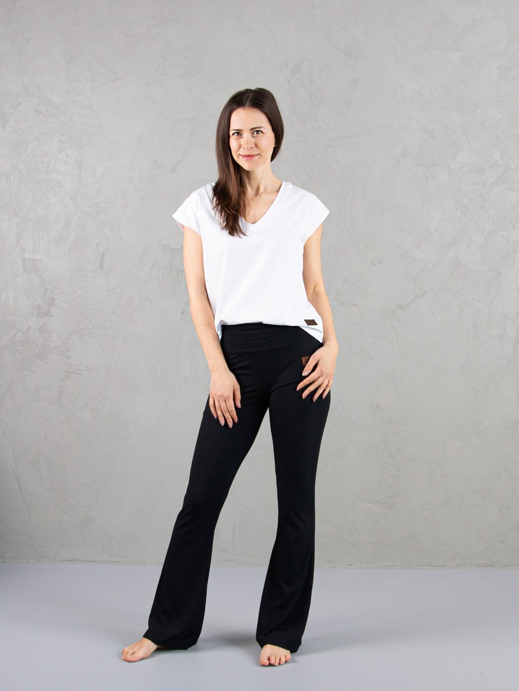 - Bavlněný úplet s elastanem – materiál je příjemný na dotek, skvěle se nosí a přizpůsobí se pohybu během dne.