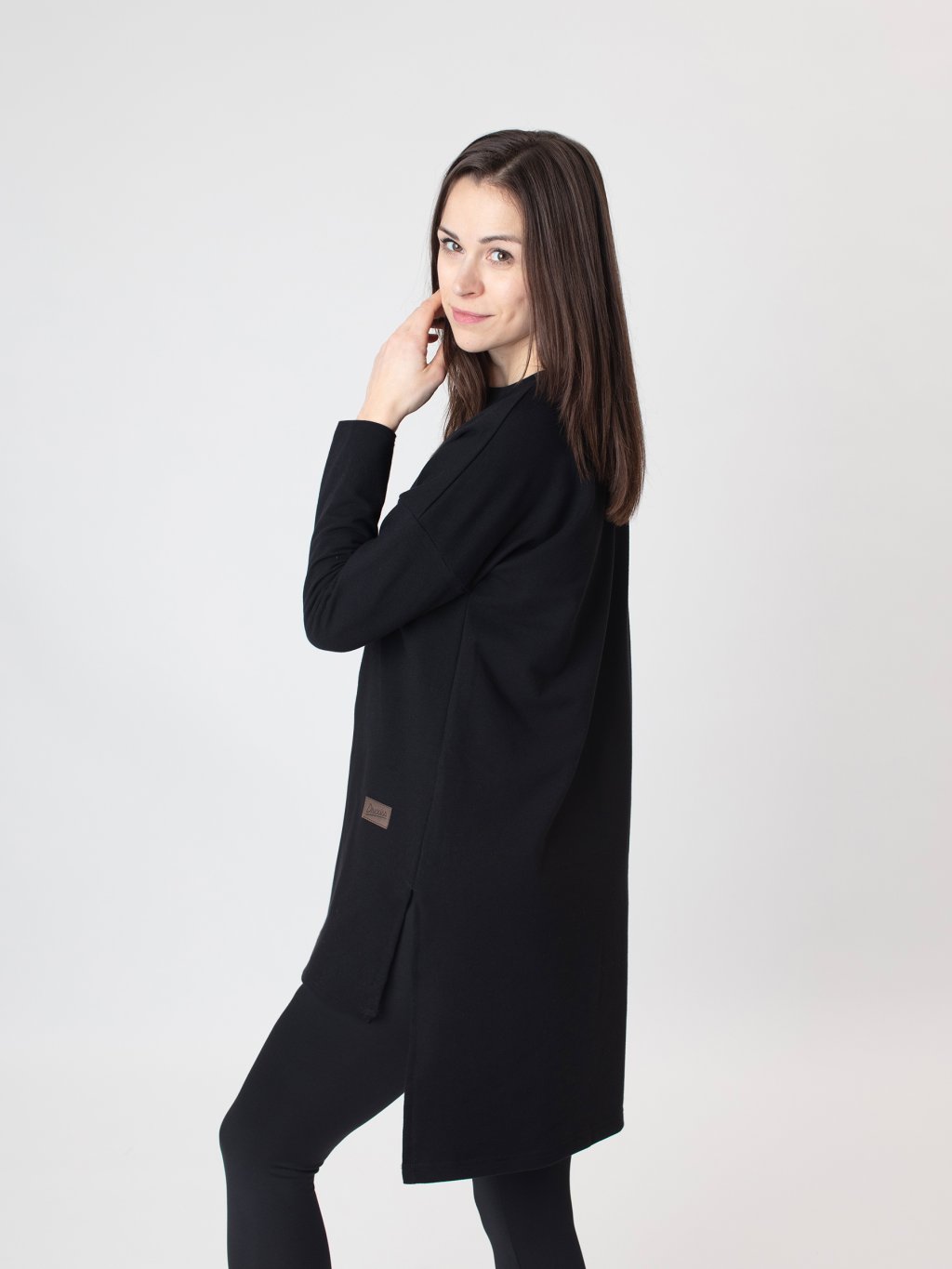 Minimalistický design umožňuje snadné kombinování – skvěle vypadá s legínami, džínami i úzkými kalhotami. Tunika má kratší přední a prodloužený zadní díl – vpředu působí lehce a uvolněně, vzadu elegantně splývá; postranní rozparky přitom zajišťují pohodlné nošení a volnost pohybu.