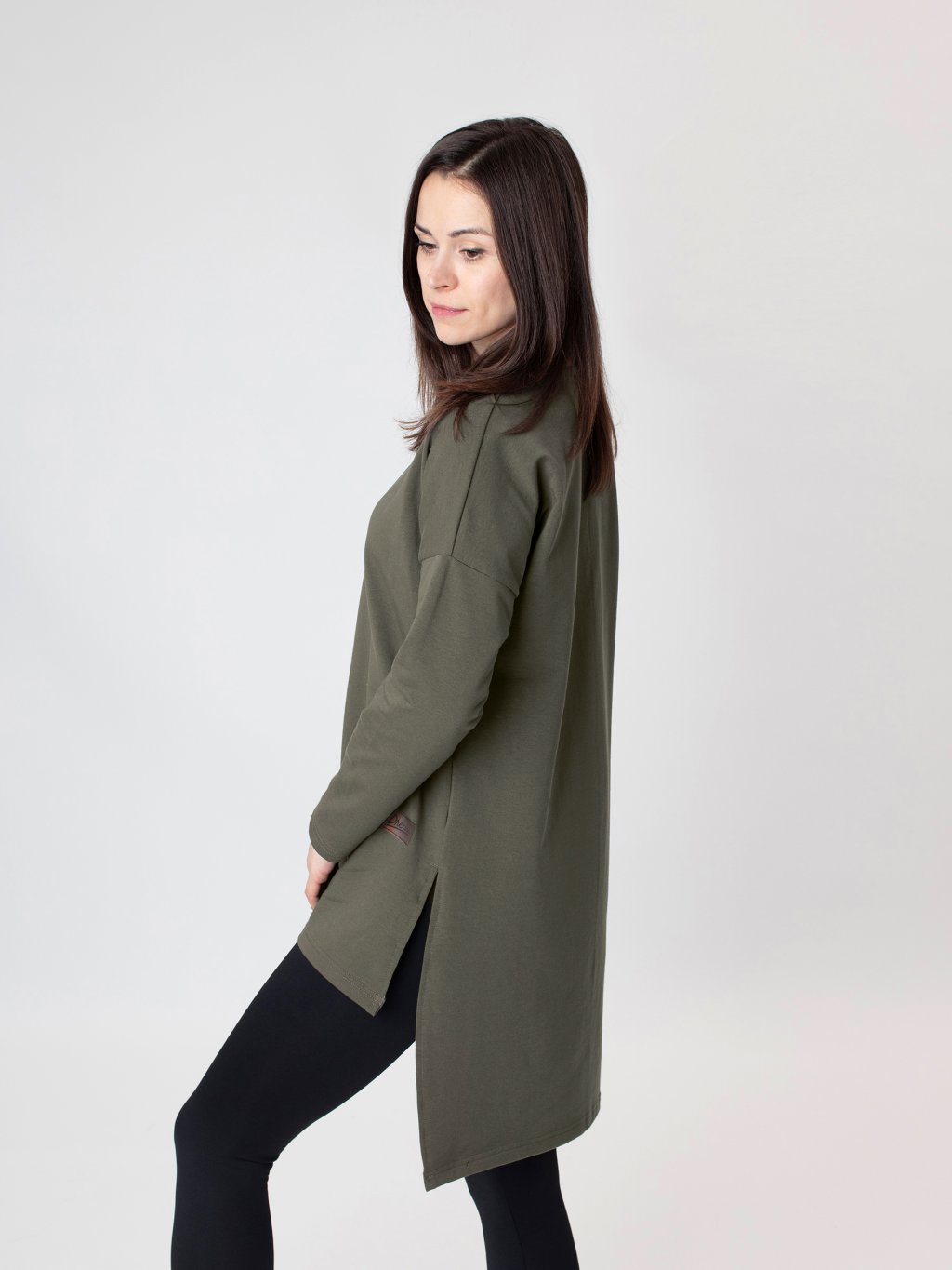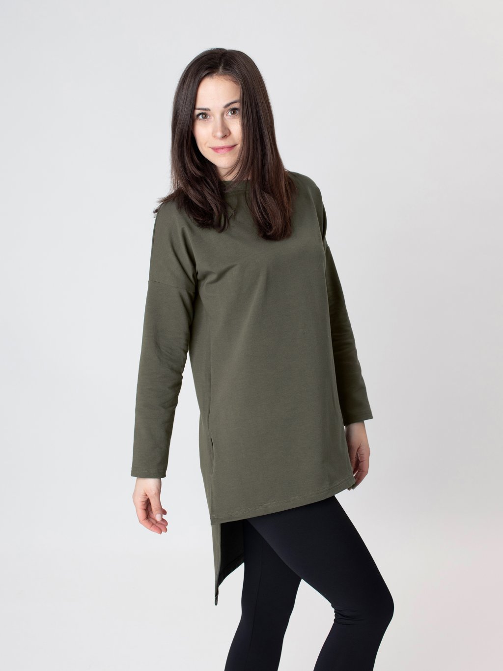 Minimalistický design umožňuje snadné kombinování – skvěle vypadá s legínami, džínami i úzkými kalhotami. Tunika má kratší přední a prodloužený zadní díl – vpředu působí lehce a uvolněně, vzadu elegantně splývá; postranní rozparky přitom zajišťují pohodlné nošení a volnost pohybu.