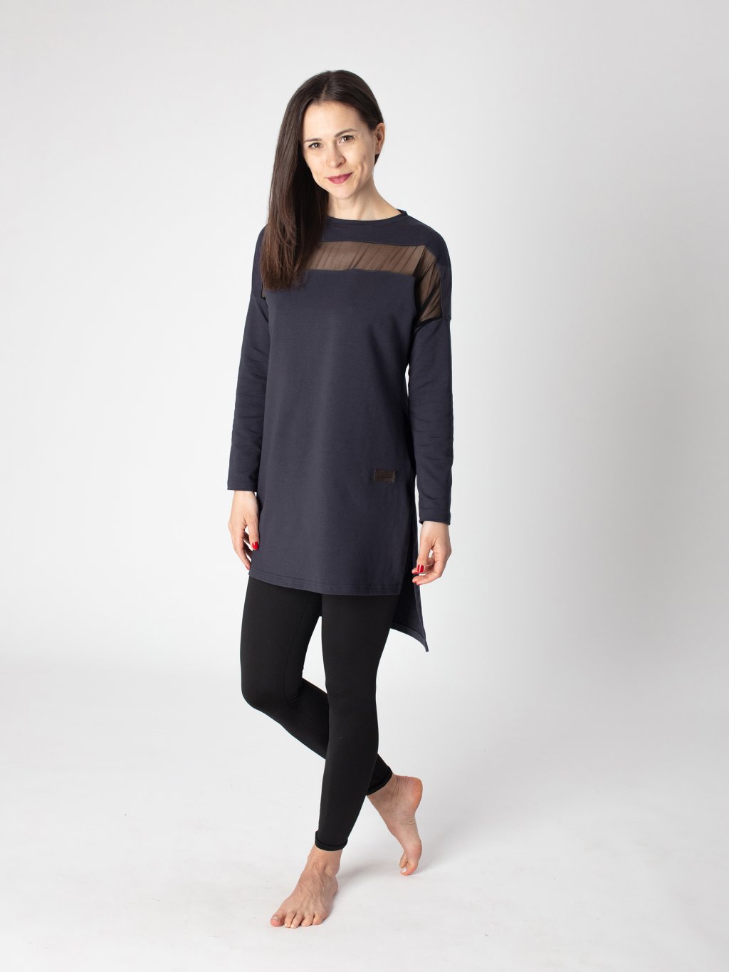 Minimalistický design umožňuje snadné kombinování – skvěle vypadá s legínami, džínami i úzkými kalhotami. Tunika má kratší přední a prodloužený zadní díl – vpředu působí lehce a uvolněně, vzadu elegantně splývá; postranní rozparky přitom zajišťují pohodlné nošení a volnost pohybu.