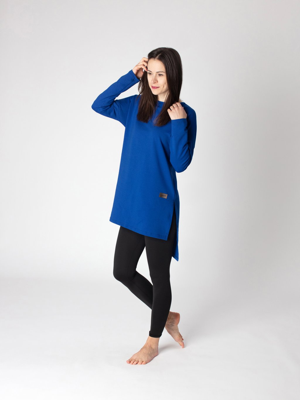 Minimalistický design umožňuje snadné kombinování – skvěle vypadá s legínami, džínami i úzkými kalhotami. Tunika má kratší přední a prodloužený zadní díl – vpředu působí lehce a uvolněně, vzadu elegantně splývá; postranní rozparky přitom zajišťují pohodlné nošení a volnost pohybu.