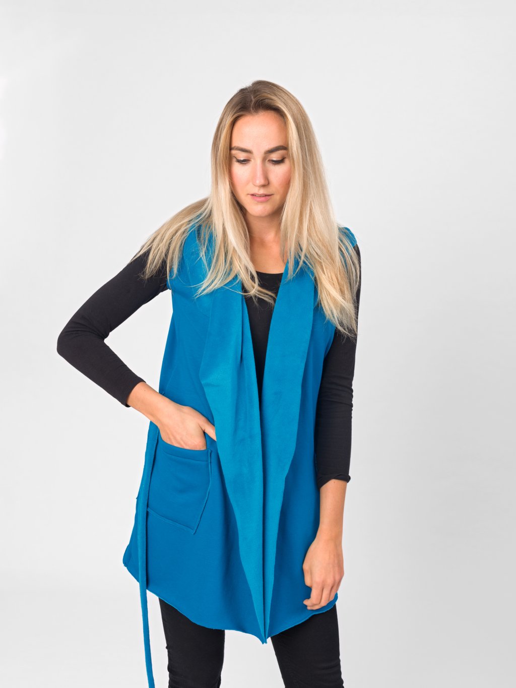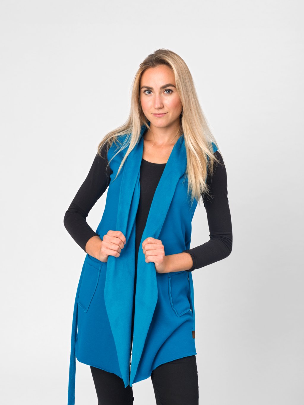 - Elegantní střih s páskem – decentní pásek zvýrazní ženské křivky a umožní nosit vestu jak zavázanou pro hřejivý efekt, tak volně rozevřenou pro ležérní look.